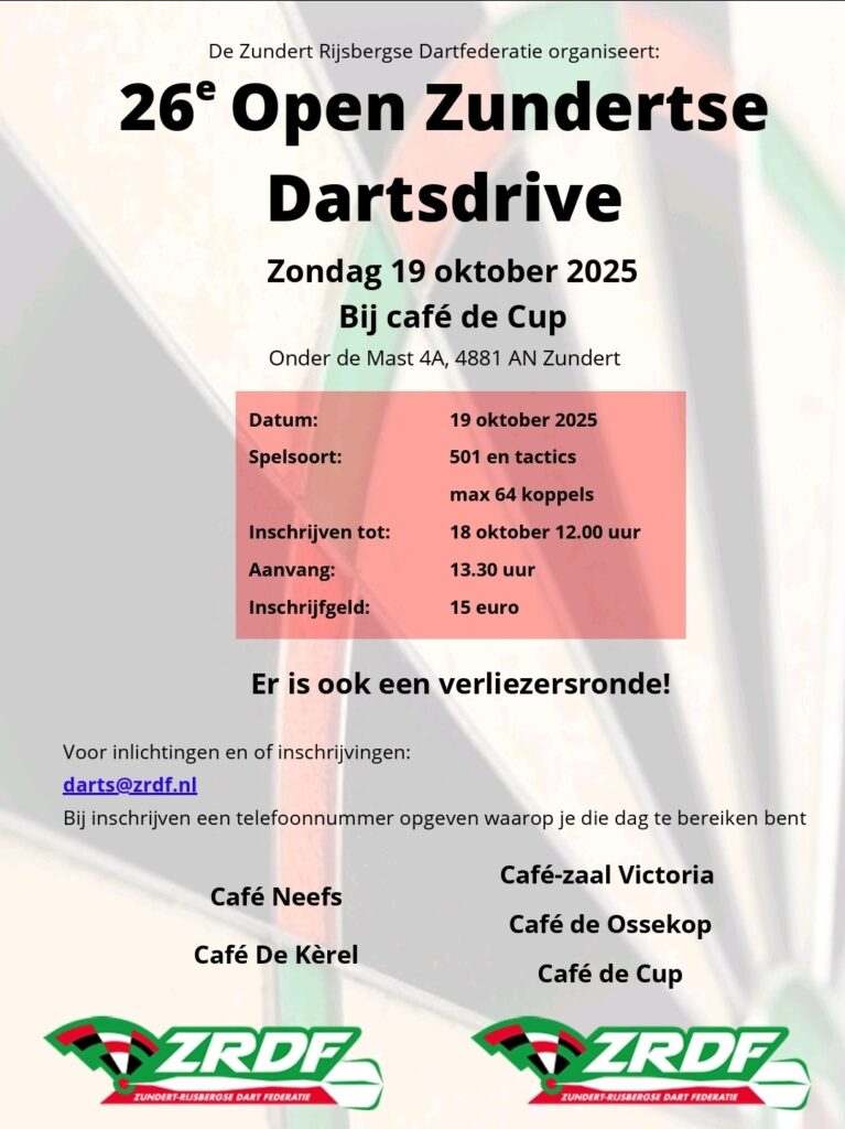 Op zondag 19 oktober vindt de 26e Open Zundertse Dartsdrive plaats.