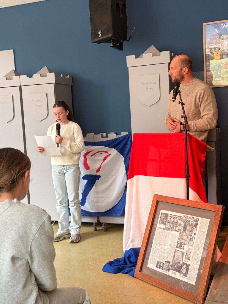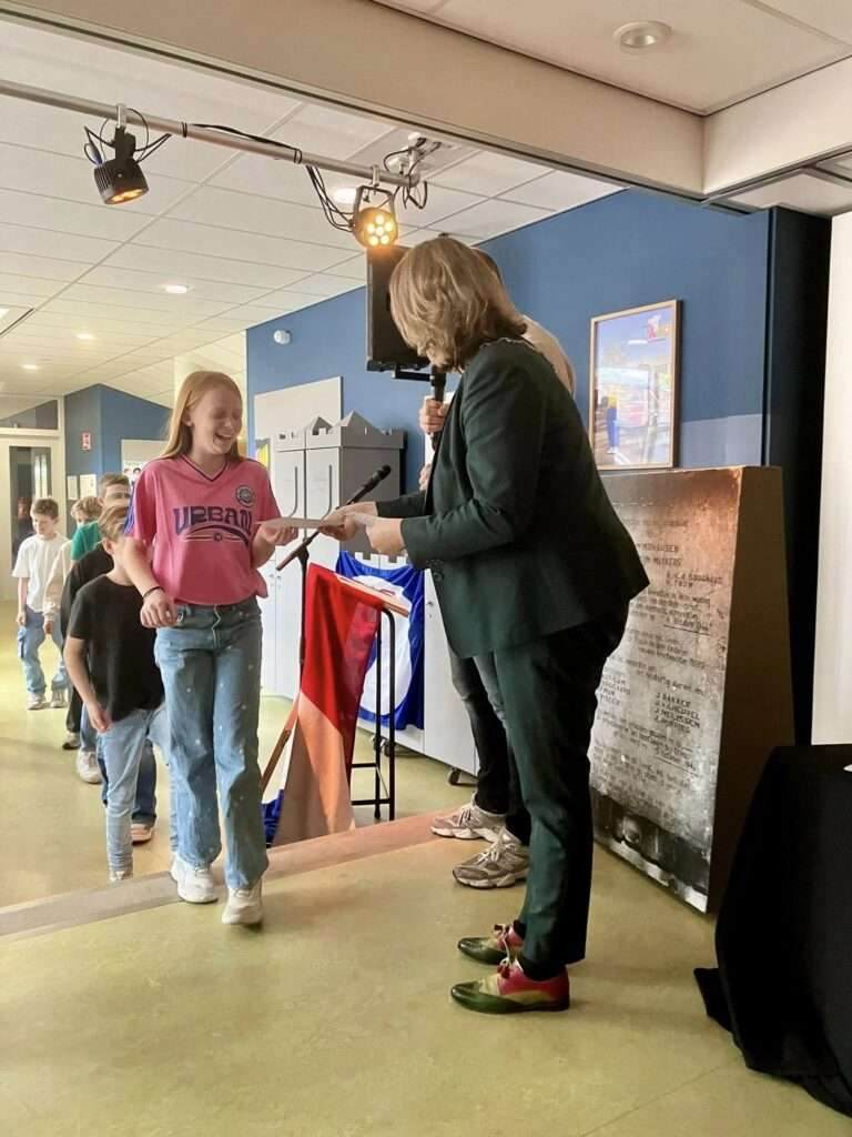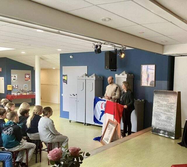 Gisteren in de middag heeft groep 8 van de Sint Bavoschool de adoptie van het monument op de Vloeiweide overgedragen aan groep 7. Een bijeenkomst waarbij de leerlingen samen met ons stil hebben gestaan bij de betekenis van vrijheid. Het is dit jaar 40 jaar geleden dat de St. Bavoschool de zorg voor het monument op de Vloeiweide op zich heeft genomen.