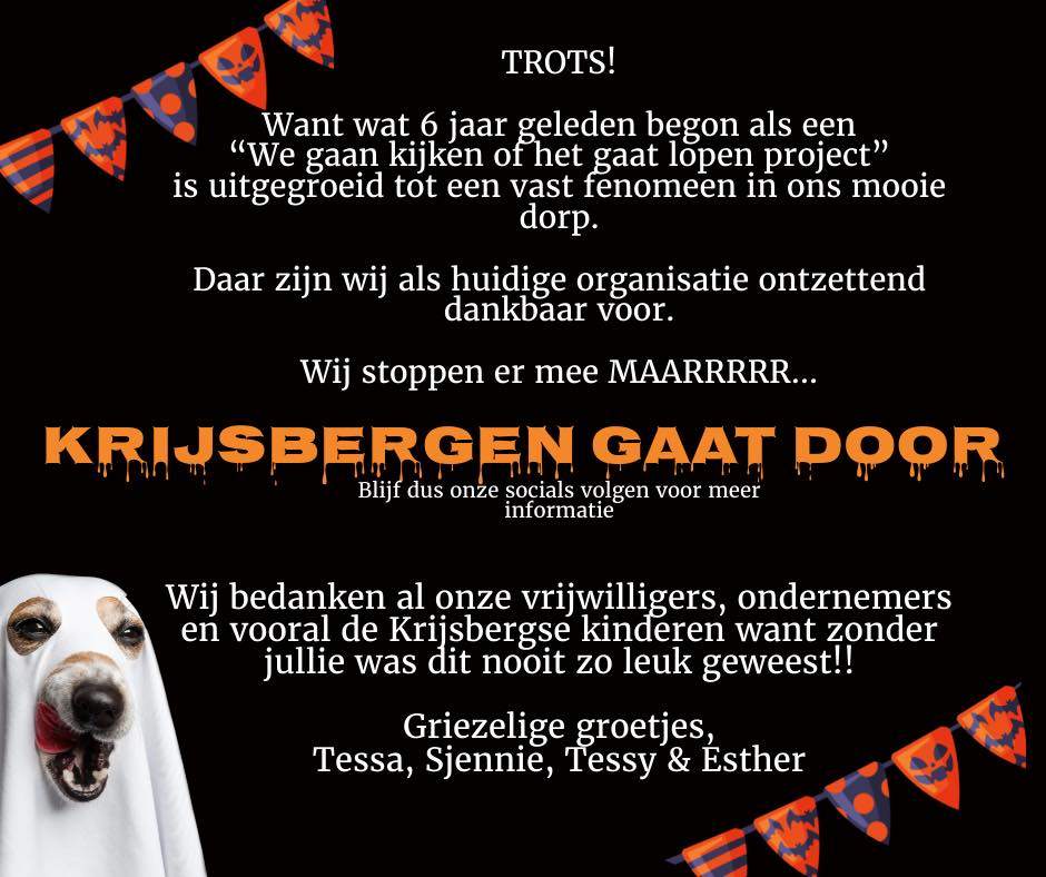 Home Facebook Halloween Rijsbergen FacebookHalloween Krijsbergen Halloween Rijsbergen Door Rijsbergen Digitaal - 2 november 2025 98 Foto Halloween Rijsbergen (Bron/foto: Halloween Rijsbergen) Na weer een geweldige avond nemen wij afscheidโฆ maarrr Foto Halloween Rijsbergen Foto Halloween Rijsbergen GERELATEERDE ARTIKELENMEER VAN DEZE AUTEUR 10e speelronde kampioenschap driebanden Teams Rijsbergen 2026. Vogelrevalidatiecentrum Zundert Marlies op bezoek bij Halloween Rijsbergen