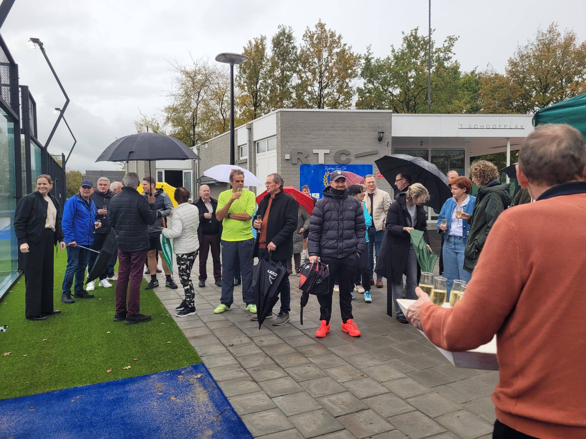 In de stromende regen opende voorzitter Kees Daamen samen met wethouder Wesley van Steen de prachtige banen..
