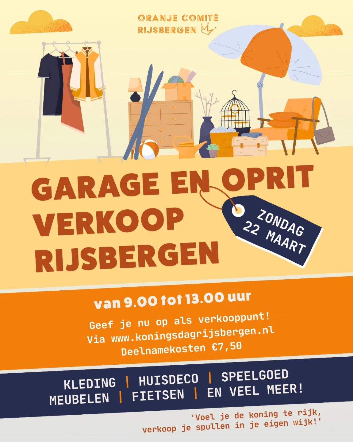 Op zondag 22 maart 2026 organiseert het Oranjecomité Rijsbergen de 5e editie van de Garage-/Opritverkoop!