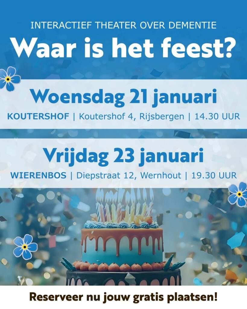 Ontdek op een luchtige en herkenbare manier wat dementie betekent bij de voorstelling ‘Waar is het feest’. Soms ontroerend, soms grappig, maar altijd leerzaam. Je leert beter kijken, luisteren en reageren met rust, humor en begrip. Kom kijken, leer en ervaar hoe je met begrip en humor kunt omgaan met dementie.