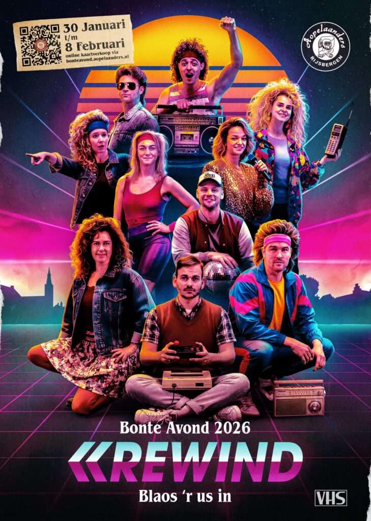 Onder de titel REWIND nemen we je mee terug in de tijd tijdens de Bonte Avond 2026!