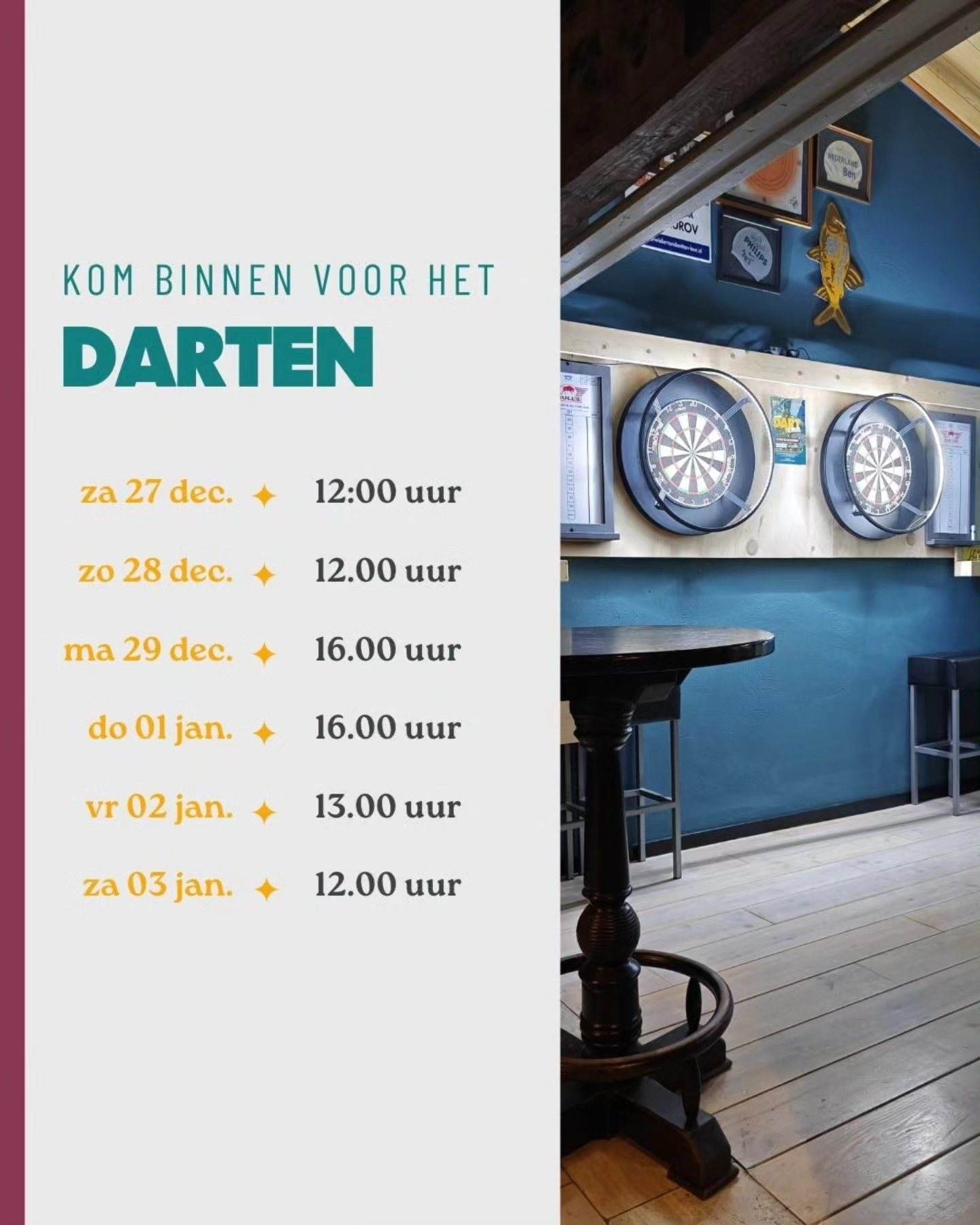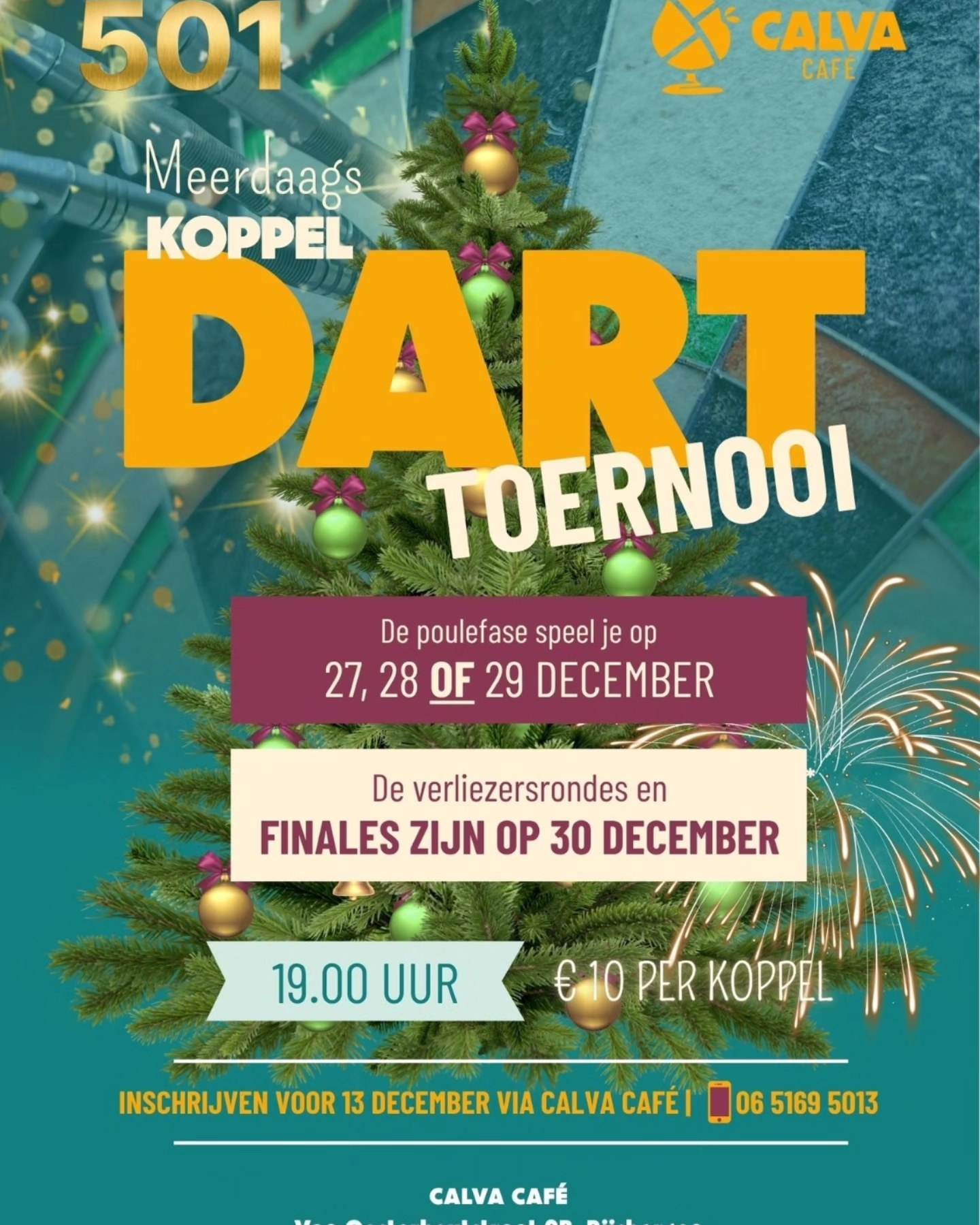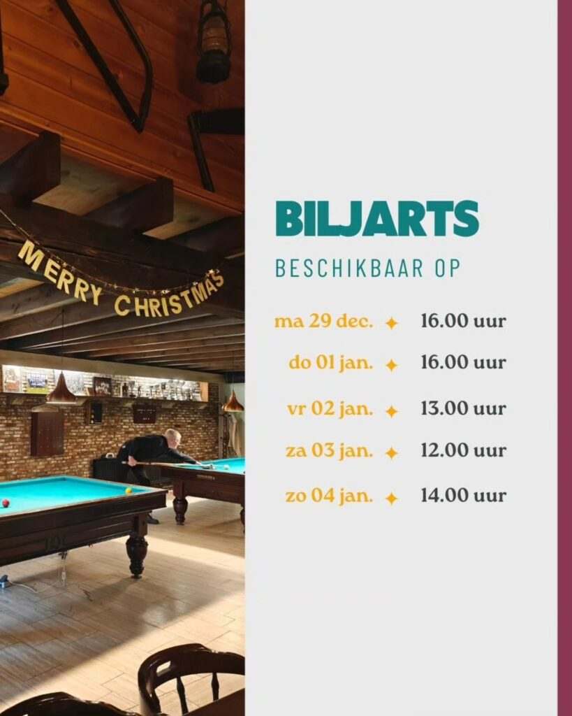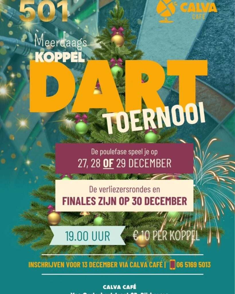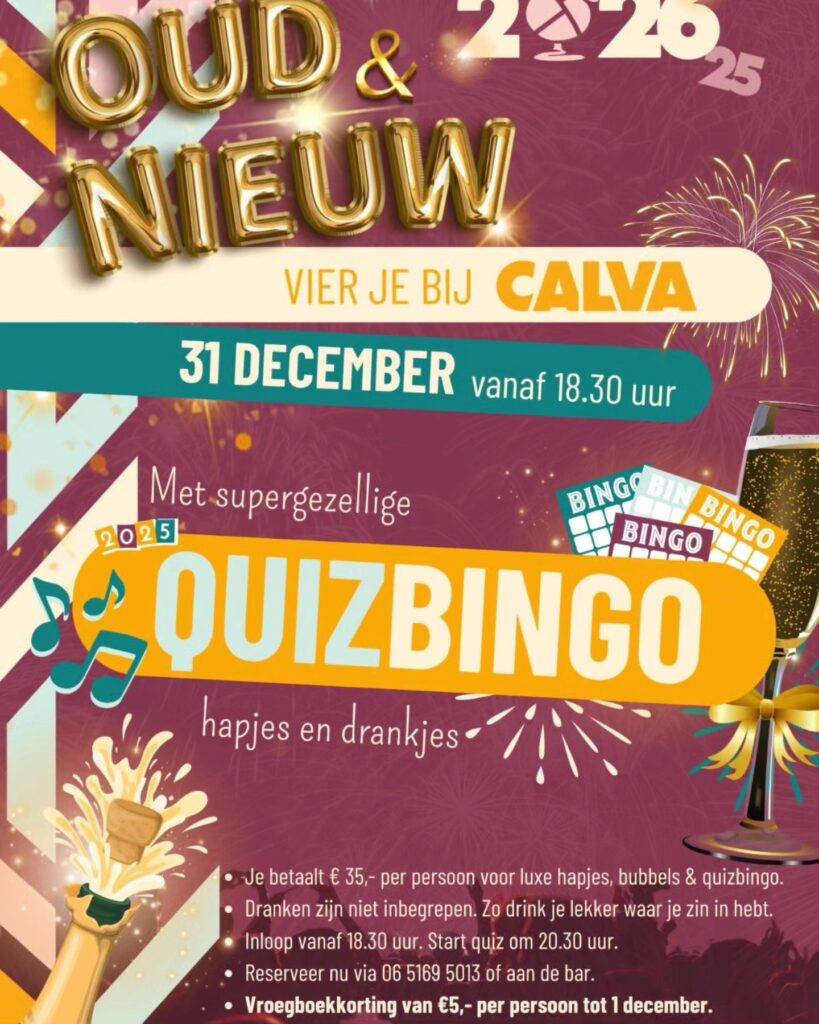 Dus kom binnen voor het darten, biljarten, een oudjaarsborrel of een toost op het nieuwe jaar. Vier het niet alleen, maar bij Calva, gezellig met elkaar.