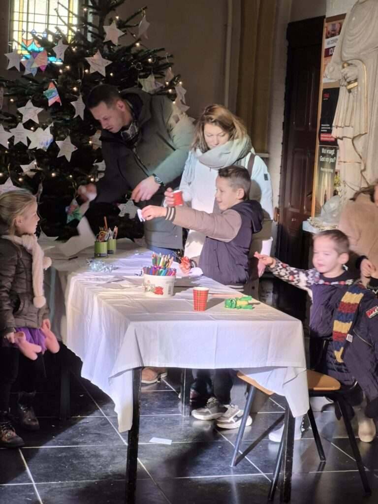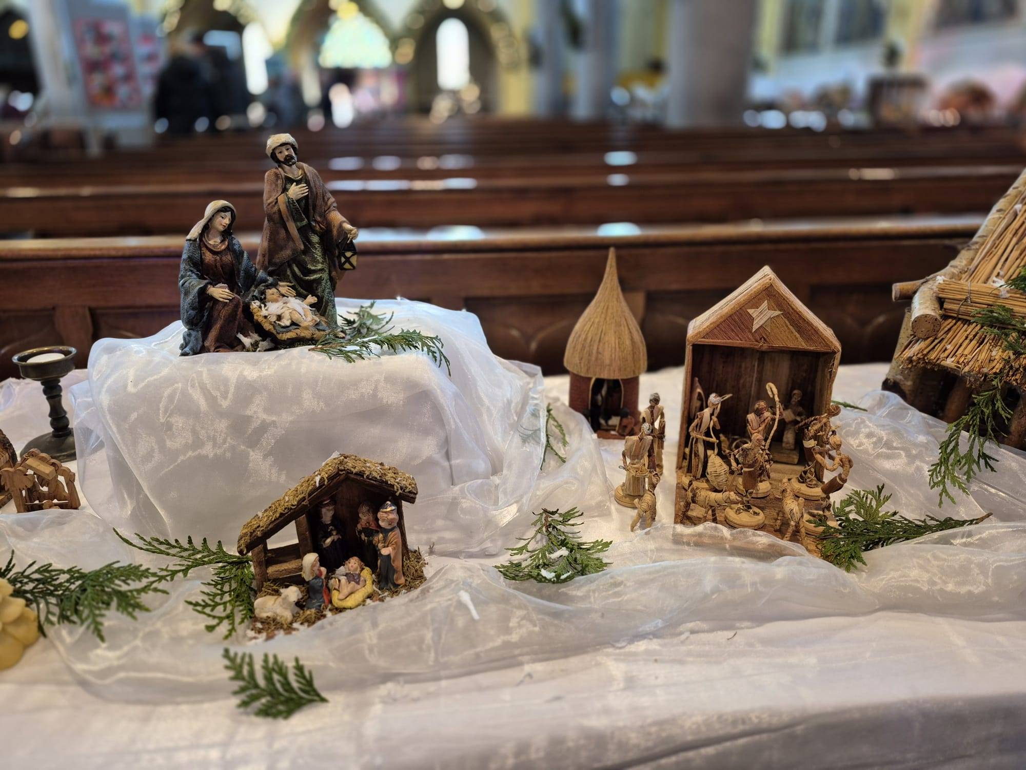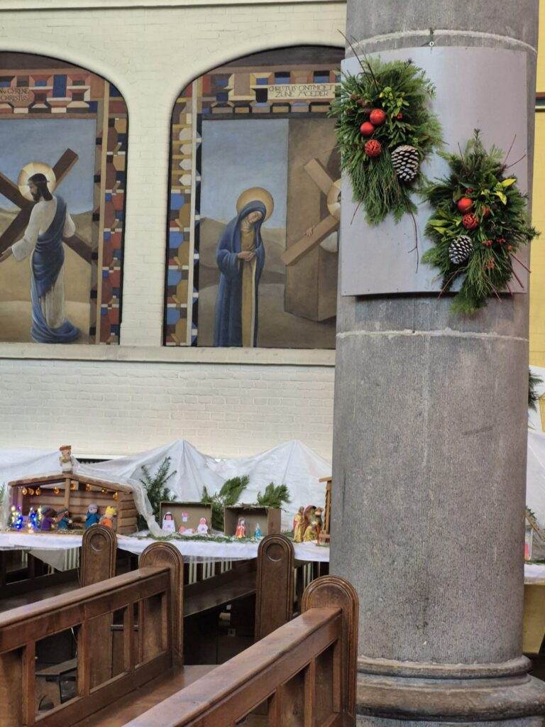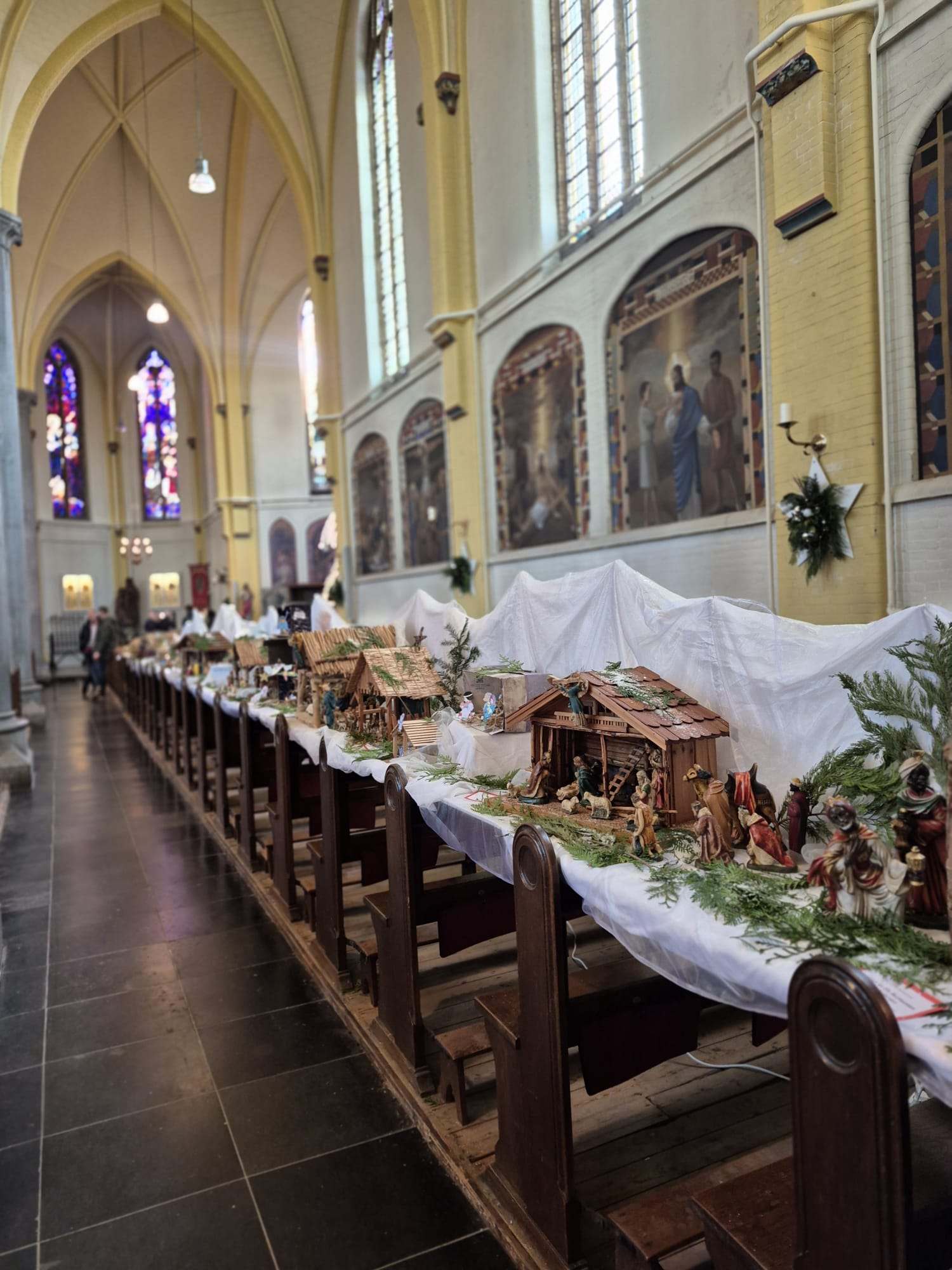 In een prachtig versierde kerk stonden weer vele grote en kleine stallen opgesteld. Mooi opgemaakt met witte doeken en groene coniferentakjes.