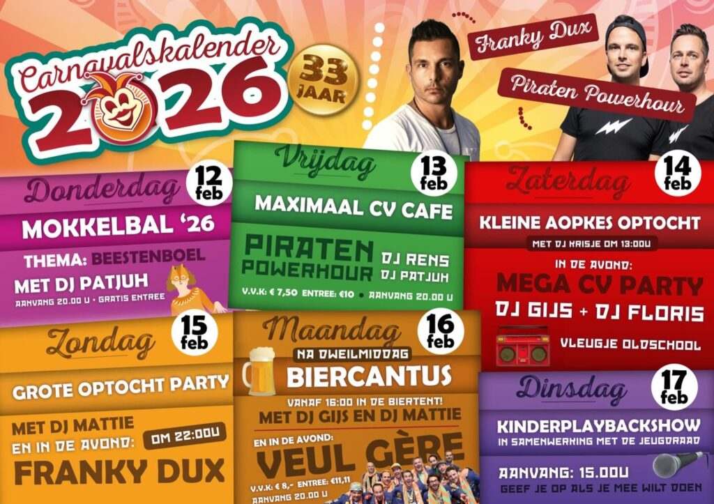 Met trots presenteren we dan ook het programma voor Carnaval 2026. Van donderdag 12 tot en met dinsdag 17 februari is het volle bak bij ons!