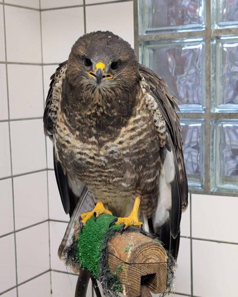 Deze mooie buizerd kwam drie weken geleden via de dierenambulance bij ons binnen. Hij was vast komen te zitten in een omheining en kreeg daarbovenop ook nog eens een trap van een koe.