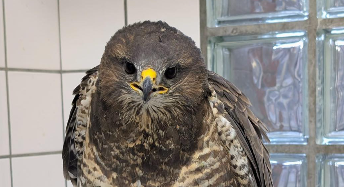 Deze mooie buizerd kwam drie weken geleden via de dierenambulance bij ons binnen. Hij was vast komen te zitten in een omheining en kreeg daarbovenop ook nog eens een trap van een koe.