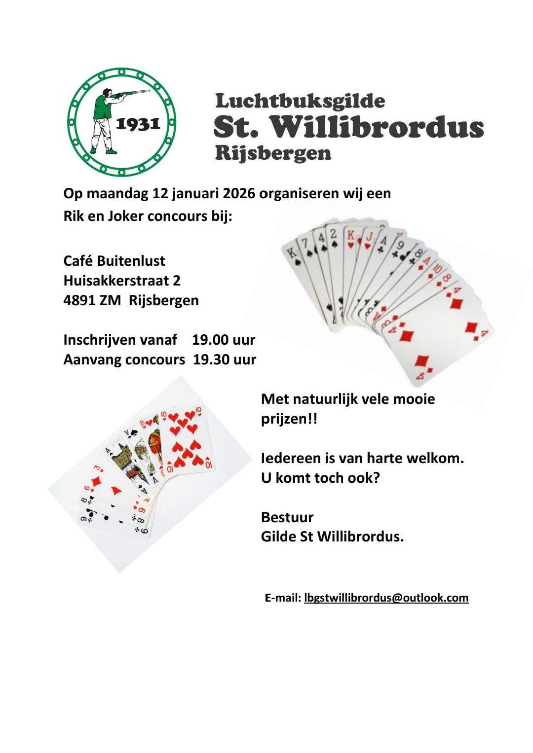 Home Facebook Rik en Joker Concours van Luchtbuksgilde St Willibrordus FacebookLuchtbuksgilde St Willibrordus Rik en Joker Concours van Luchtbuksgilde St Willibrordus Door Rijsbergen Digitaal - 30 december 2025 40 (Bron/foto: Luchtbuksgilde St Willibrordus) Maandag 12 januari 2026 organiseren wij een Rik en Joker concours. Foto Luchtbuksgilde St Willibrordus GERELATEERDE ARTIKELENMEER VAN DEZE AUTEUR Openingstijden raadhuis, vraagwijzer en milieustraat rond jaarwisseling Avoord Rijserf Repair cafe in het Nonnekeshof Zundert