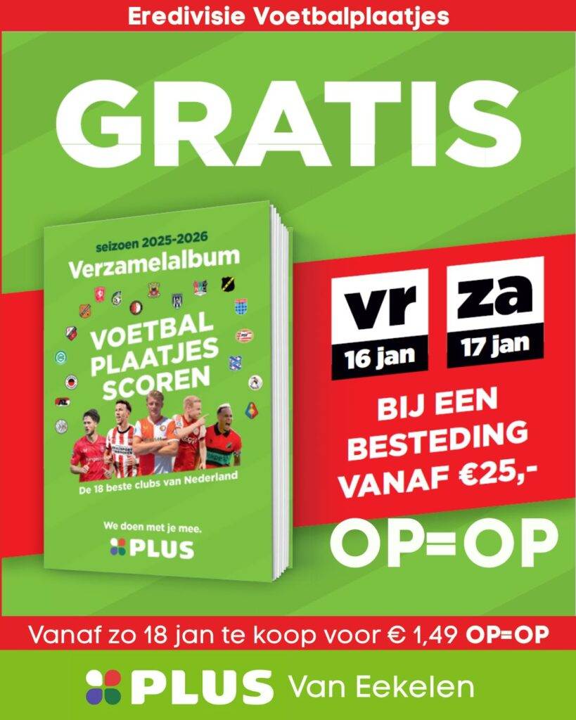 Vrijdag 16 januari en zaterdag 17 januari ontvang je 1 verzamelalbum bij โฌ25 of meer aan boodschappen. OP=OP.