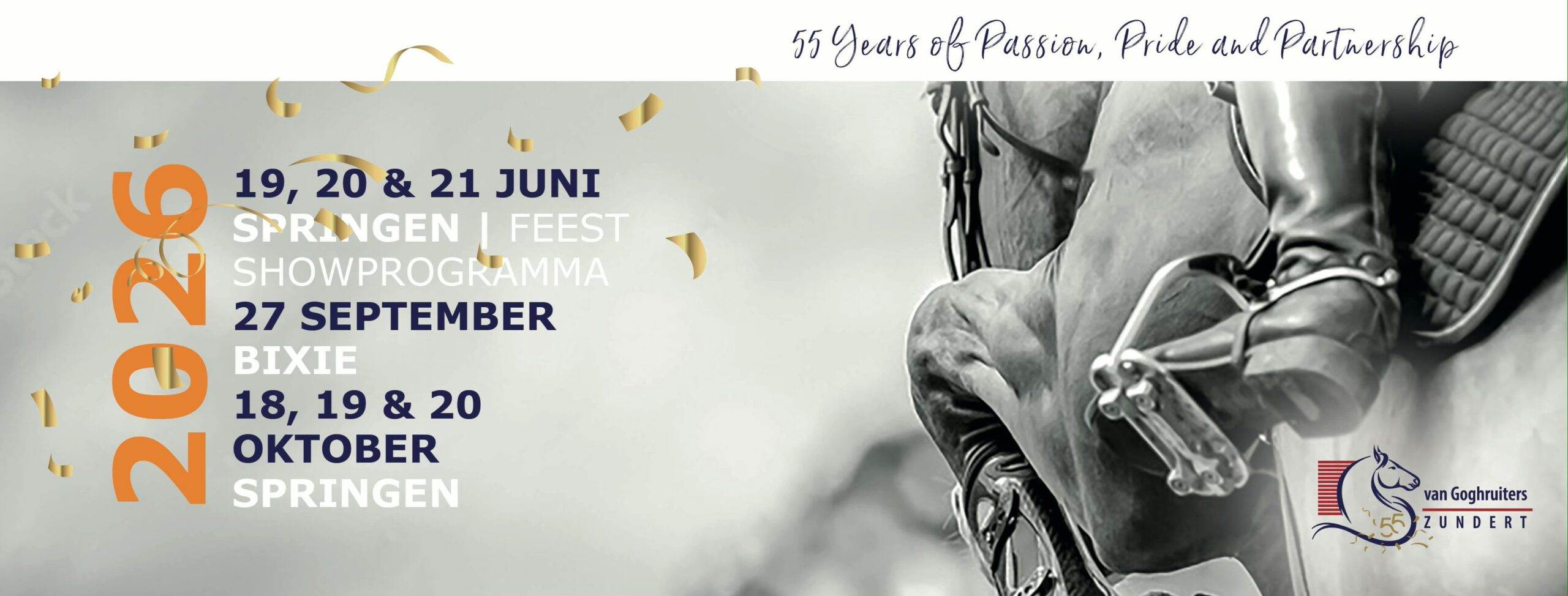 In het weekend van 19, 20 en 21 juni organiseren wij een feestelijk jubileumweekend met wedstrijden voor ponyโs en paarden, een afwisselend showprogramma en op zaterdagavond een feestavond. Tijdens deze avond staan we uiteraard stil bij 55 jaar Van Goghruiters, met herinneringen aan vroeger en het vieren van alles wat onze club heeft gebracht.