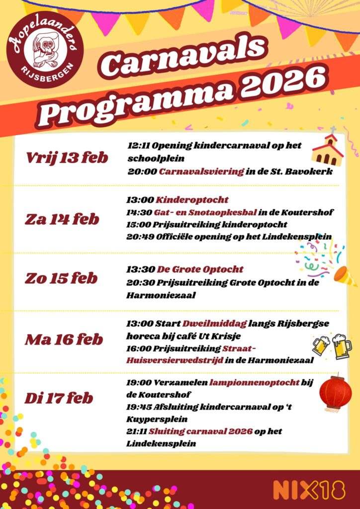 Met trots presenteren we hierbij het carnavalsprogramma: 5 dagen vol met hoogtepunten, tradities en gezelligheid voor jong en oud