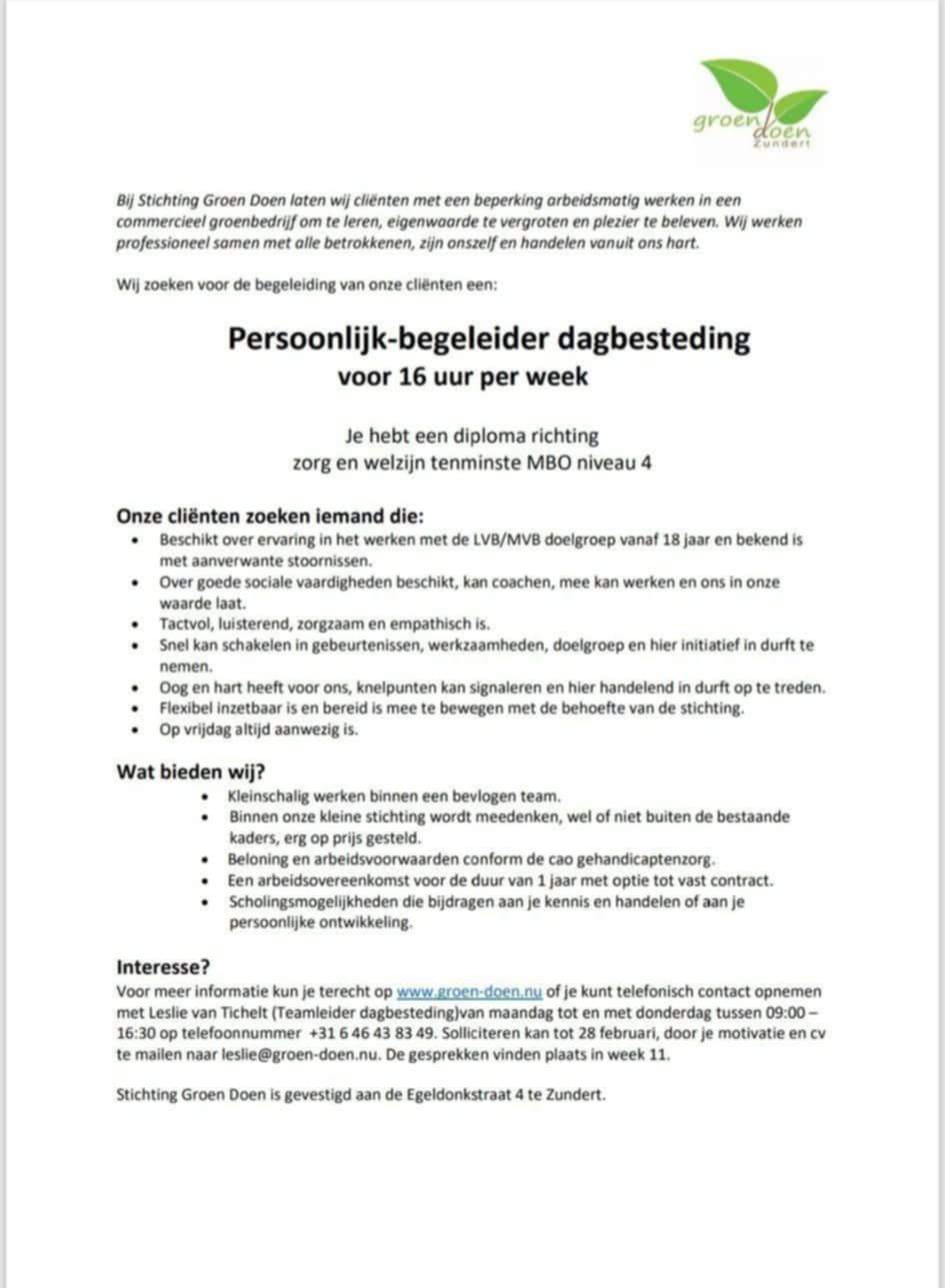 Home Facebook Groen Doen FacebookStichting Groendoen Groen Doen Door Rijsbergen Digitaal - 21 februari 2026 49 Foto Groen Doen (Bron/foto: Groen Doen) We zoeken een nieuwe collega bij Stichting Groen Doen.Website groen doen klik hier Foto Groen doen GERELATEERDE ARTIKELENMEER VAN DEZE AUTEUR Tentoonstelling Straatbeelden Zundert, Rijsbergen, Wernhout, Achtmaal, Klein-Zundert Koutershof Rijsbergen Jolly Cafe 2.0