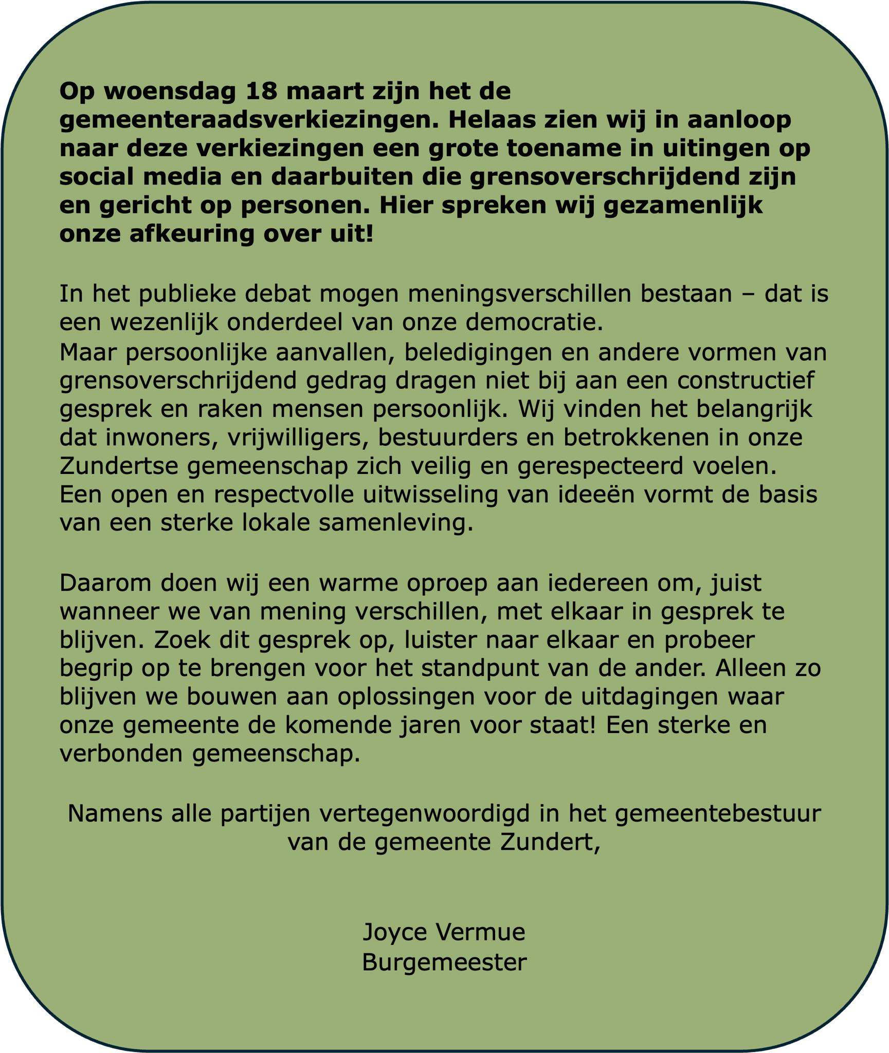 Home Burgemeester Joyce Vermue Burgemeester Joyce Vermue Burgemeester Joyce VermueFacebook Burgemeester Joyce Vermue Door Rijsbergen Digitaal - 5 maart 2026 51 Foto Burgemeester Joyce Vermue (Bron/foto: Burgemeester Joyce Vermue) Foto Burgemeester Joyce Vermue GERELATEERDE ARTIKELENMEER VAN DEZE AUTEUR Inzameling oud papier en karton: 6 en 7 Maart 2026 Parochie Christus Koning DJA Zundert: Avondvierdaagse