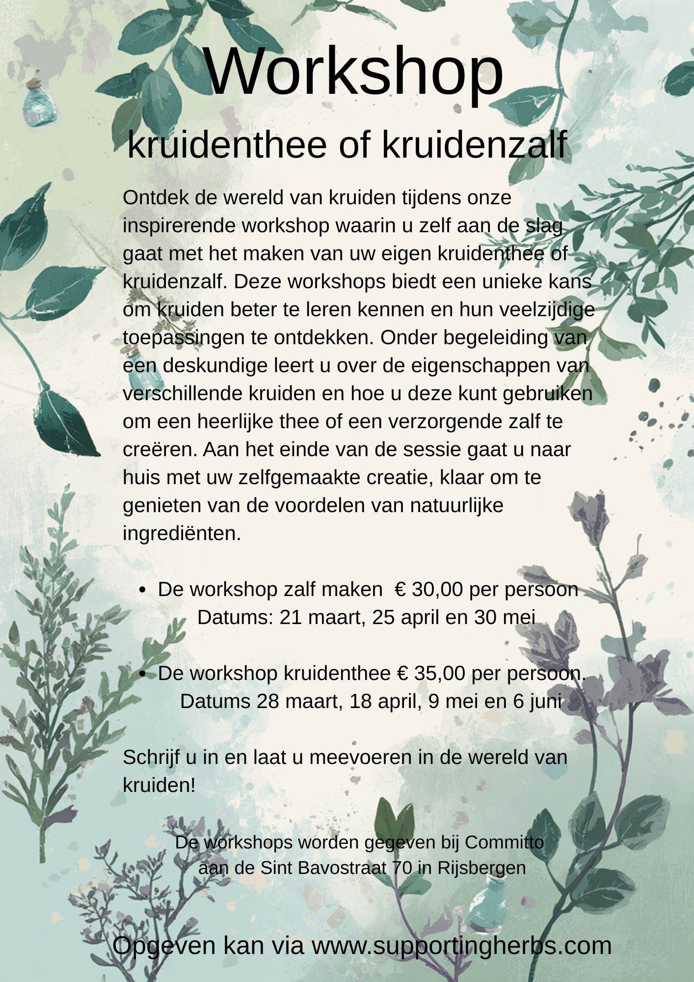 Inschrijven kan via www.supportingherbs.com via de mail contact@supportingherbs.com of in de winkel van Committo ‘t Opstapje in Rijsbergen