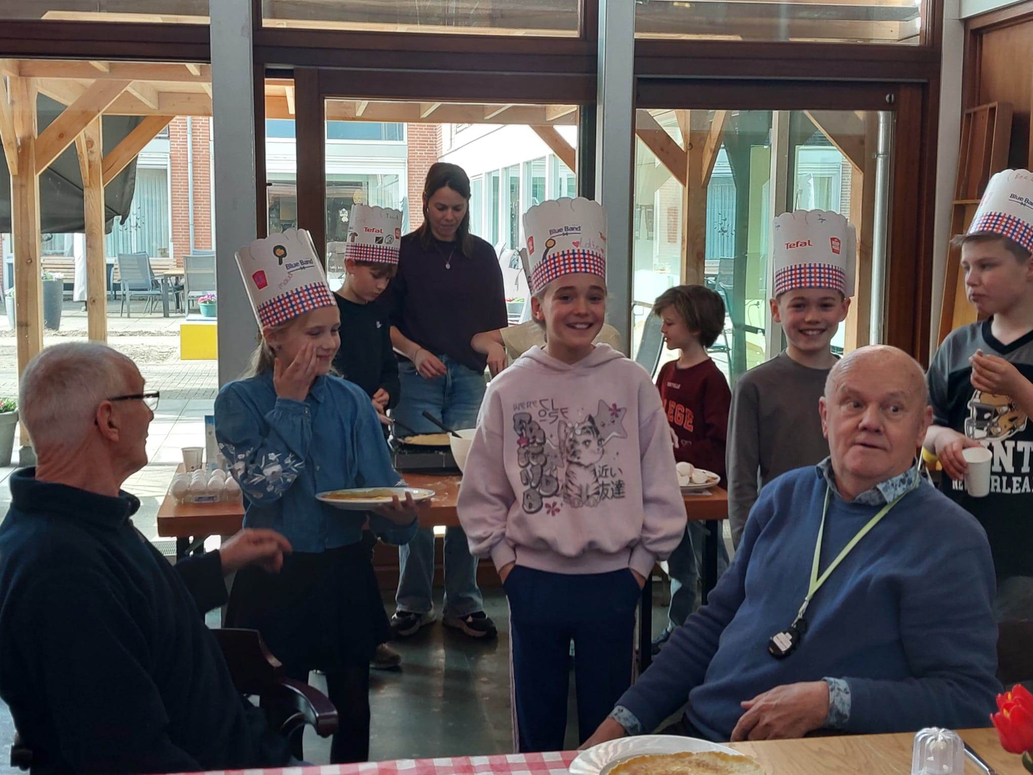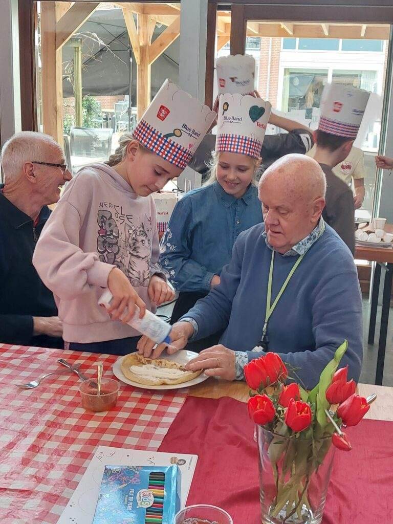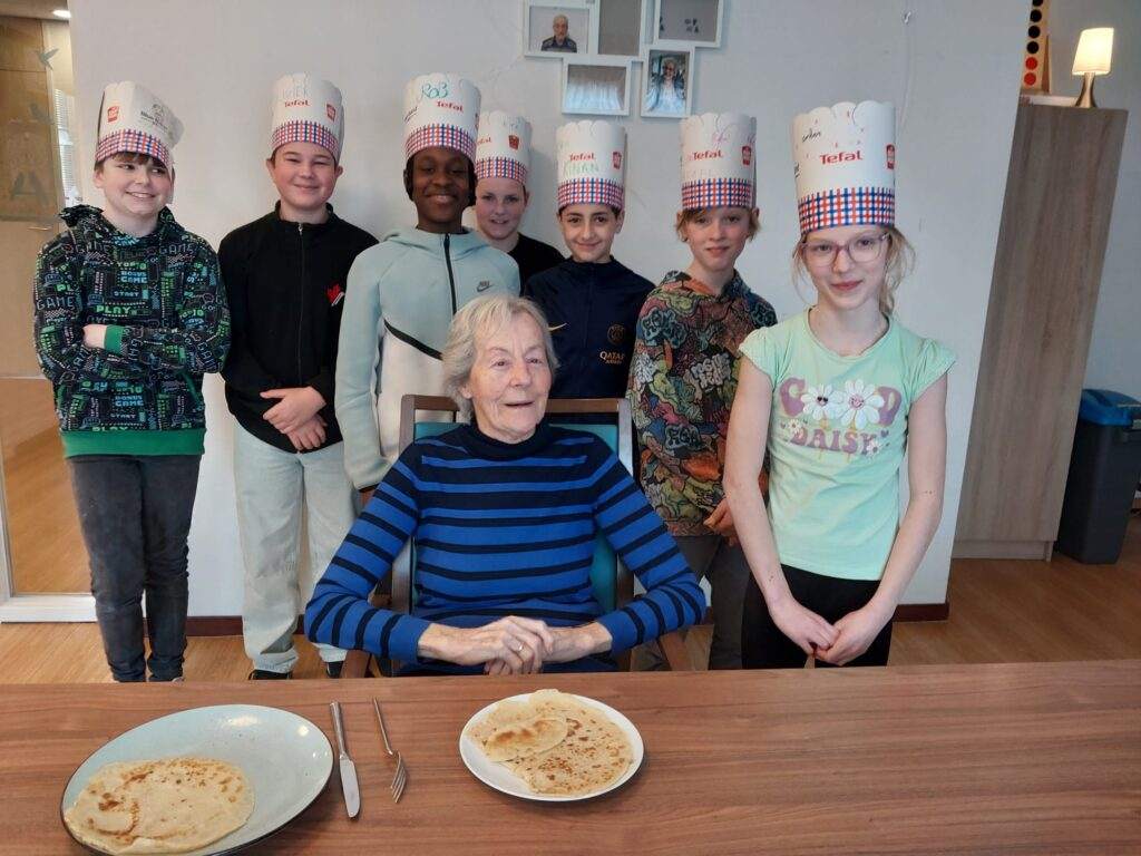 Het zorgde voor zoveel mooie momenten: dankbare blikken, grote glimlachen en vooral samen genieten. Zelfs bewoners die liever op hun eigen groep bleven, werden niet vergeten – de kinderen brachten de pannenkoeken persoonlijk langs.