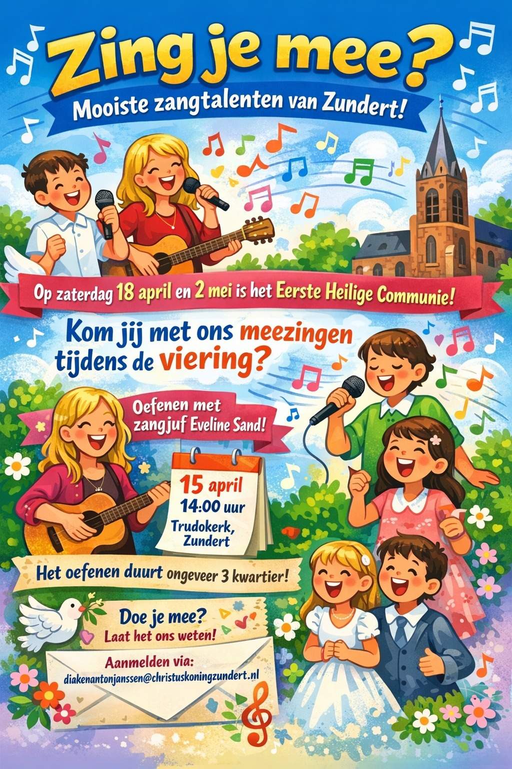 Zing je mee tijdens de communievieringen op 18 april en 2 mei? De enige echte Eveline Sand begeleidt alle nachtegaaltjes.