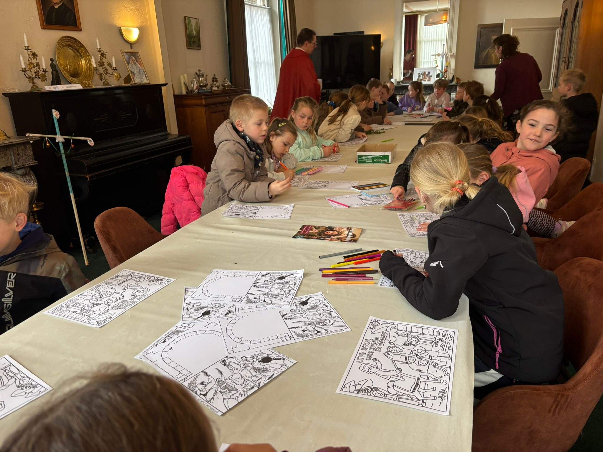 Tijdens de kindernevendienst hebben ze lekker gekleurd en geknutseld. Na afloop van de viering kregen ze nog een opdracht: geef je palmpasenkruis aan iemand die ziek of eenzaam is.