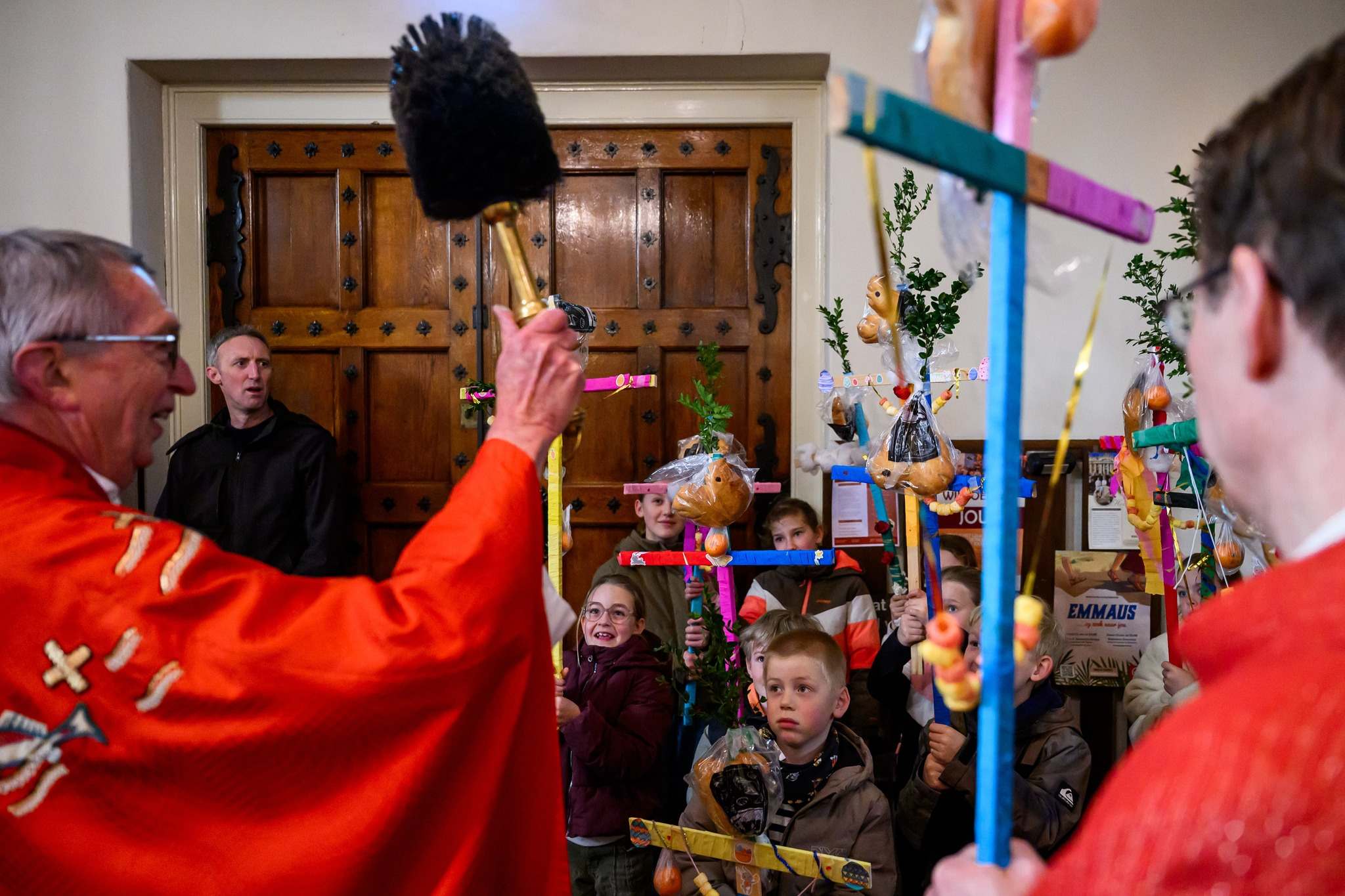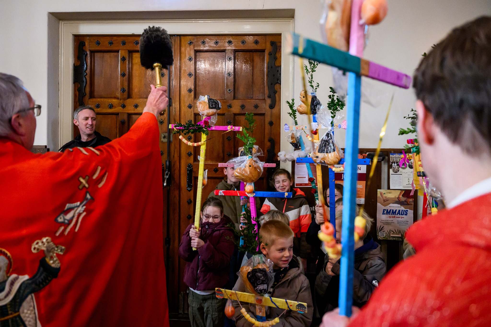 Bijna 30 kinderen hebben gisteren hard gewerkt om hun palmpasenkruis te versieren. En gisteren kwamen ze de Trudo kerk binnen lopen in een mooie stoet.