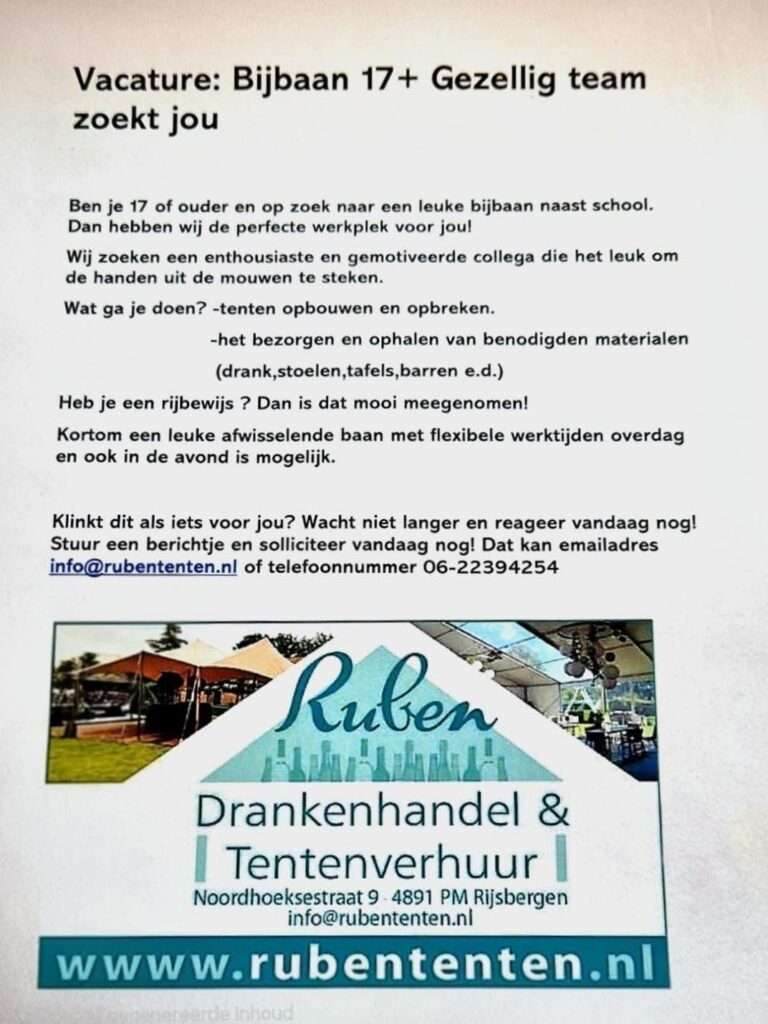 Ruben tentenverhuur en Drankenhandel zoek JOU !