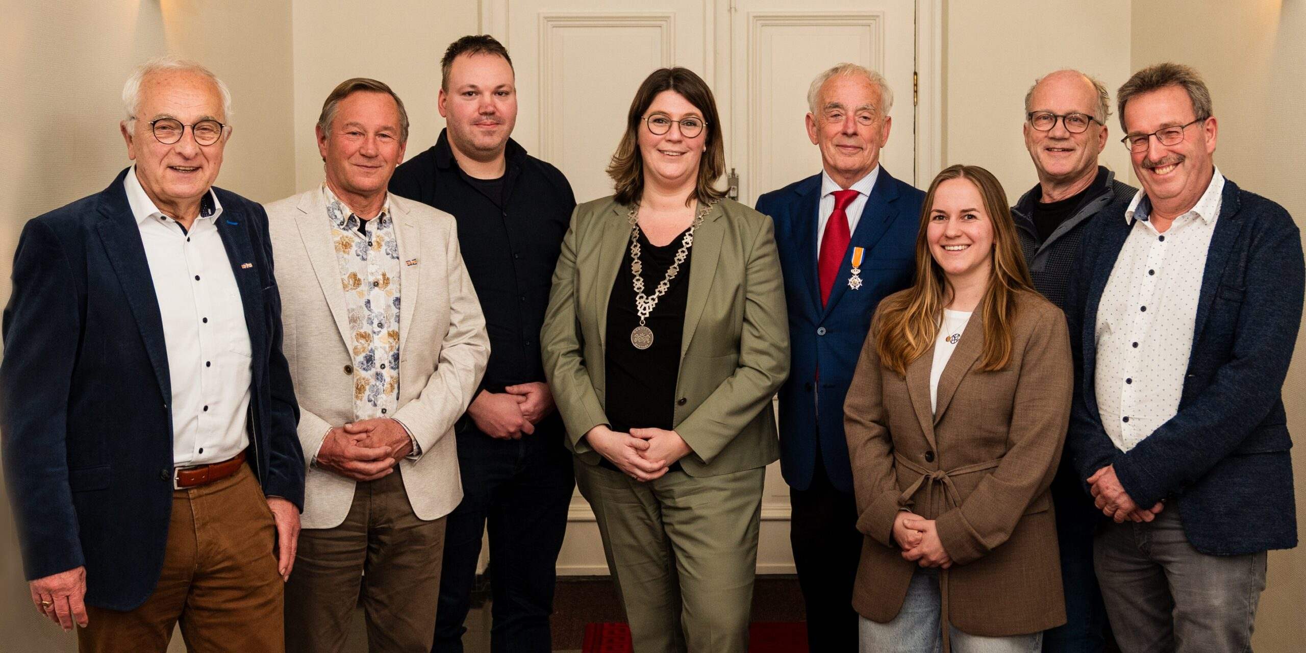 Jan Aarts (CDA), Ad van Exsel (Dorpsbelangen), Frits Brait (CDA), burgemeester Joyce Vermue, Floor Vreijsen (VVD), Lieke Michielsen (ONPL), Gerard Hertsenberg (Lokaal Perspectief) en Johan Vissers (ONPL).