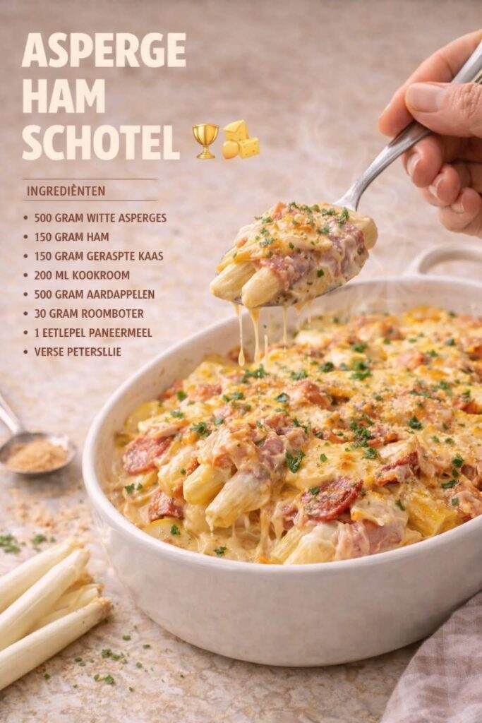 Bestrooi de schotel vlak voor het serveren eventueel met fijngehakte peterselie. Schep warm op en geniet van een heerlijke, romige en hartige aspergeschotel waar iedereen blij van wordt!