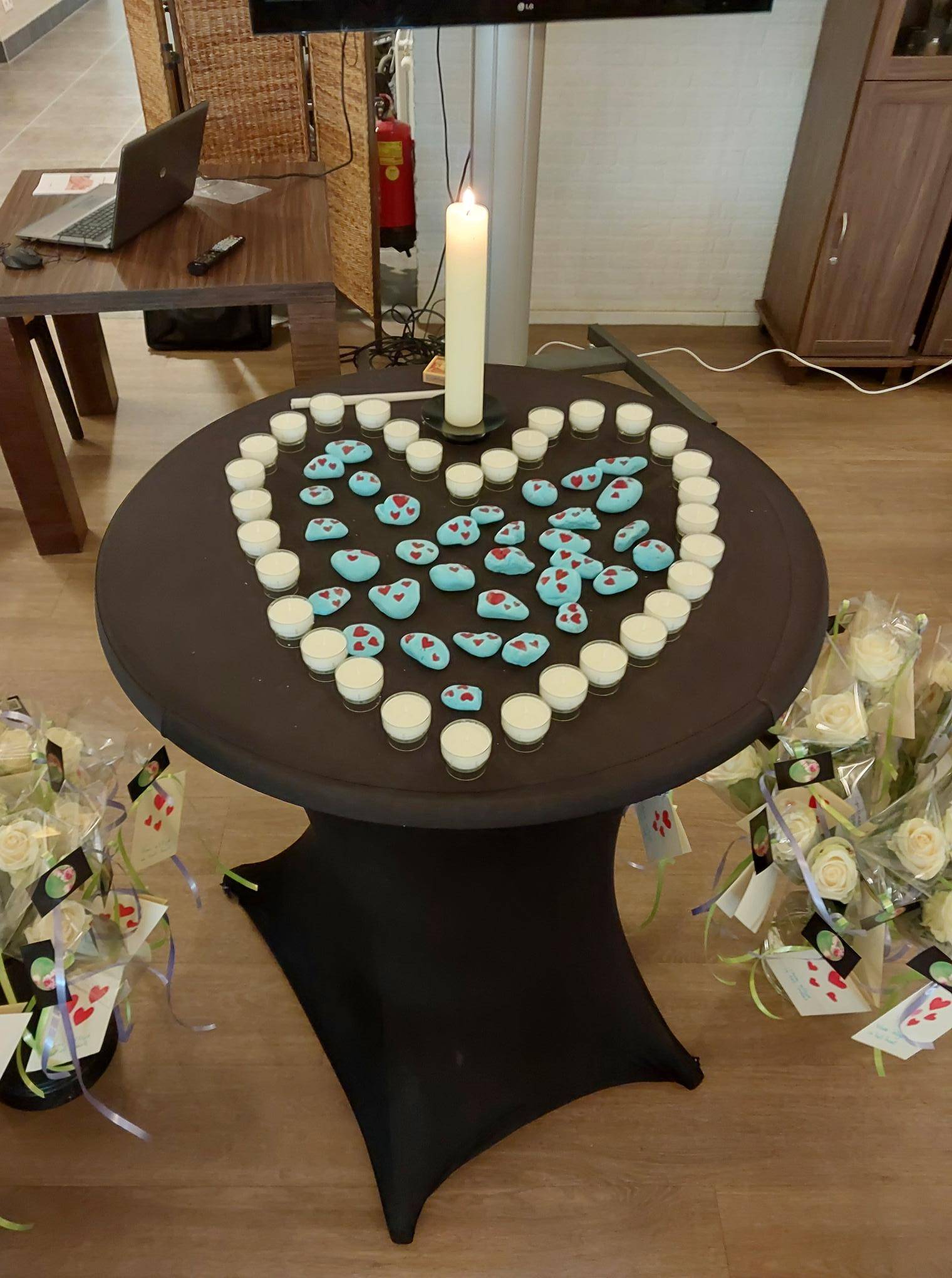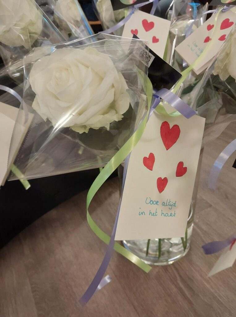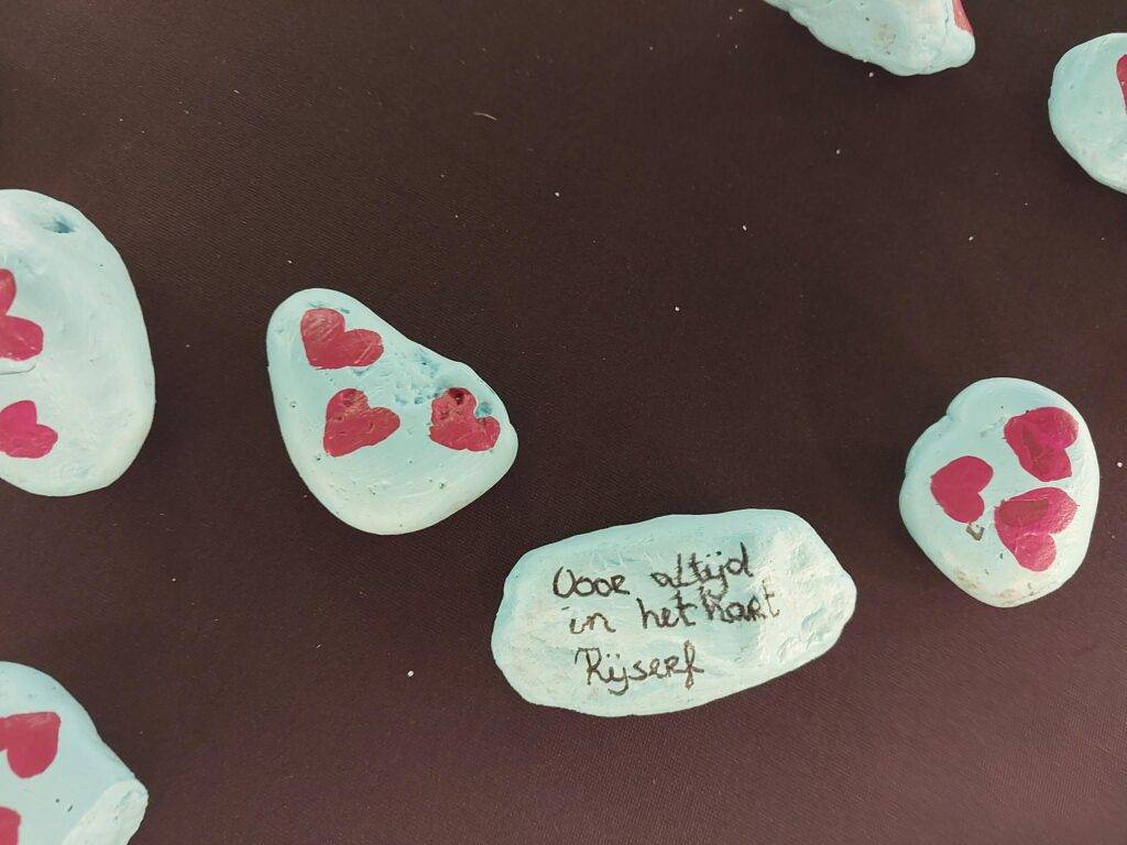 Ook waren er prachtige, met de hand beschilderde steentjes met de tekst “Voor altijd in ons hart, Rijserf”. Deze werden samen met een witte roos, voorzien van de naam van de overledene, meegegeven aan de familie.