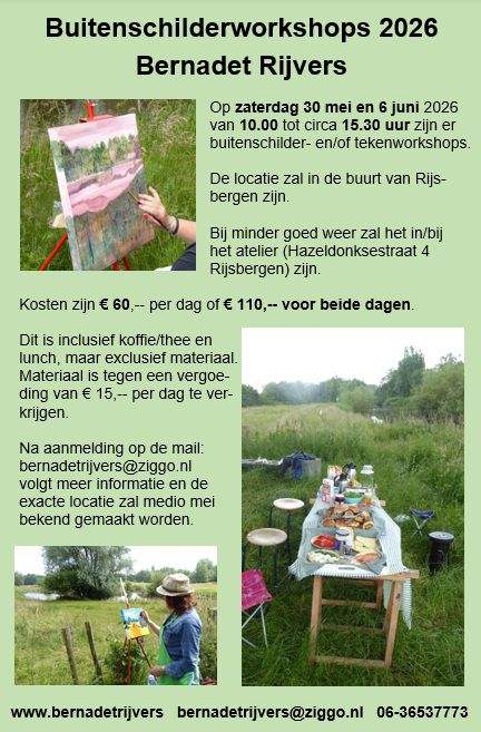 Home Algemeen Schilderworkshops 2026 Algemeen Schilderworkshops 2026 Door Rijsbergen Digitaal - 25 april 2026 20 (Bron / afbeelding: Bernadet Rijvers) GERELATEERDE ARTIKELENMEER VAN DEZE AUTEUR Zomers & Winters Snellen Tweedehandsmaterialen Visite, koffie, gebak en mooie verhalen