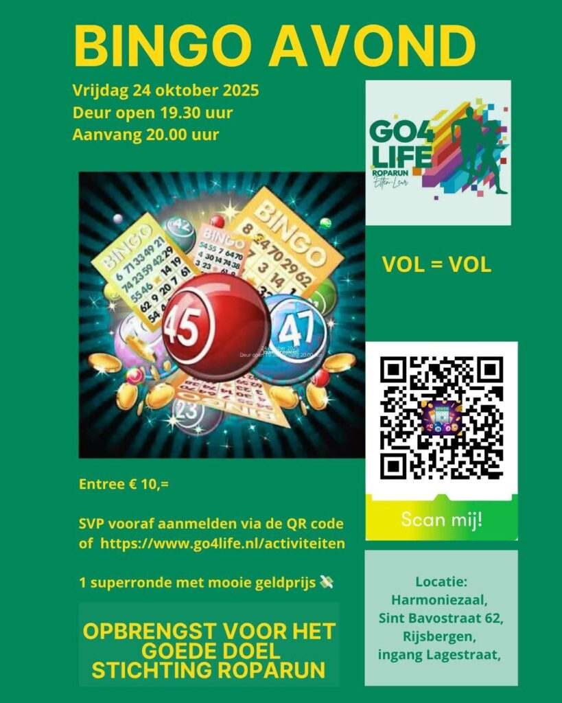 Op vrijdag 24 oktober organiseert ons Roparun team 248 – Go4Life een gezellige bingoavond om geld in te zamelen voor het goede doel.