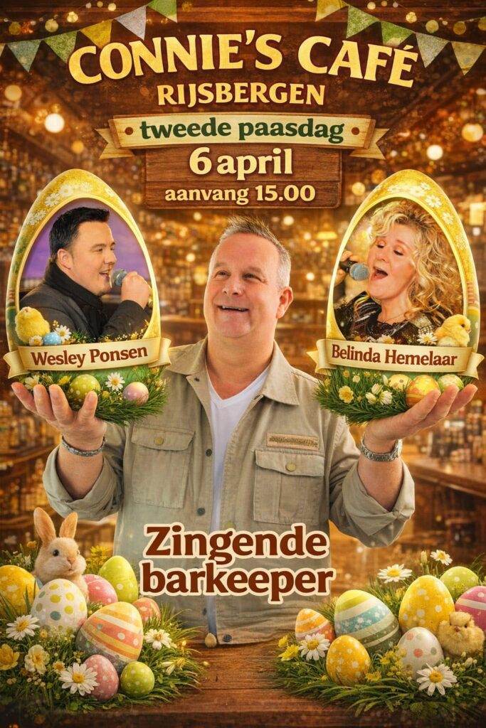 Home Diverse optredens op tweede paasdag Diverse optredens op tweede paasdag Door Rijsbergen Digitaal - 6 april 2026 3 Kaart niet beschikbaar Datum/Tijd Date(s) - 6 april 202615:00 Locatie bij Connies café Categorieën Geen Categorieën Connie’s Cafe Rijsbergen (Bron/foto: Connie’s cafe Rijsbergen) Foto Connies Cafe