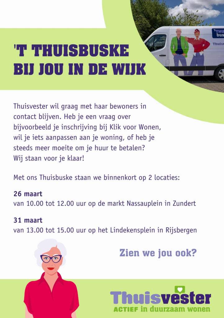 Heb je een vraag over je inschrijving bij Klik voor Wonen, overweeg je een aanpassing aan je woning of maak je je zorgen over het betalen van de huur? Binnenkort komt Thuisvester naar je toe met ’t Thuisbuske om deze en andere vragen persoonlijk te beantwoorden.